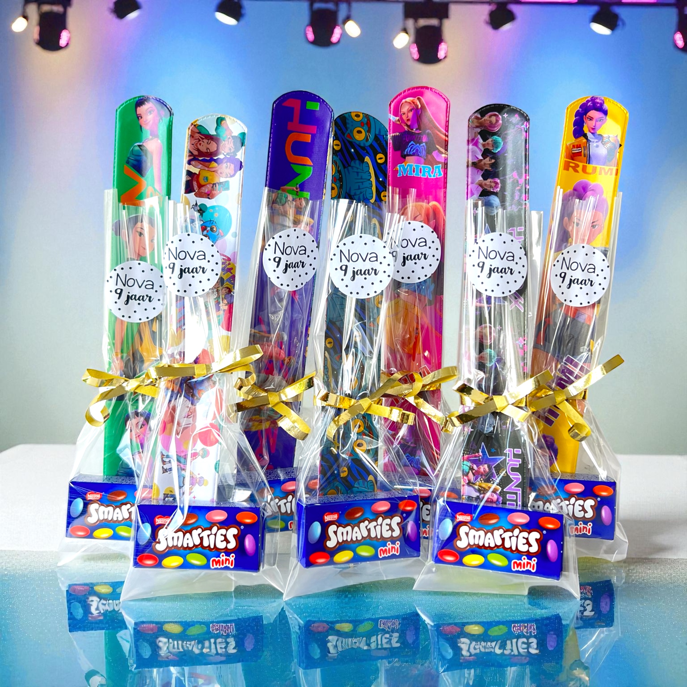 De voorverpakte traktatie bestaat uit een Konijnen glitter pen (mix van design) netjes verpakt in een ziplock zakje en optionele keuze uit Haribo-beertjes, snoepketting of Smarties